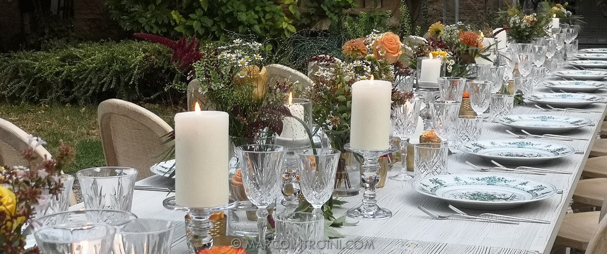 Tonalità calde per la tavola e un stile botanico classico per le composizioni dell cerimonia, con un sapiente gioco di colori , blu ,azzurro cenere, amaranto e verde acido